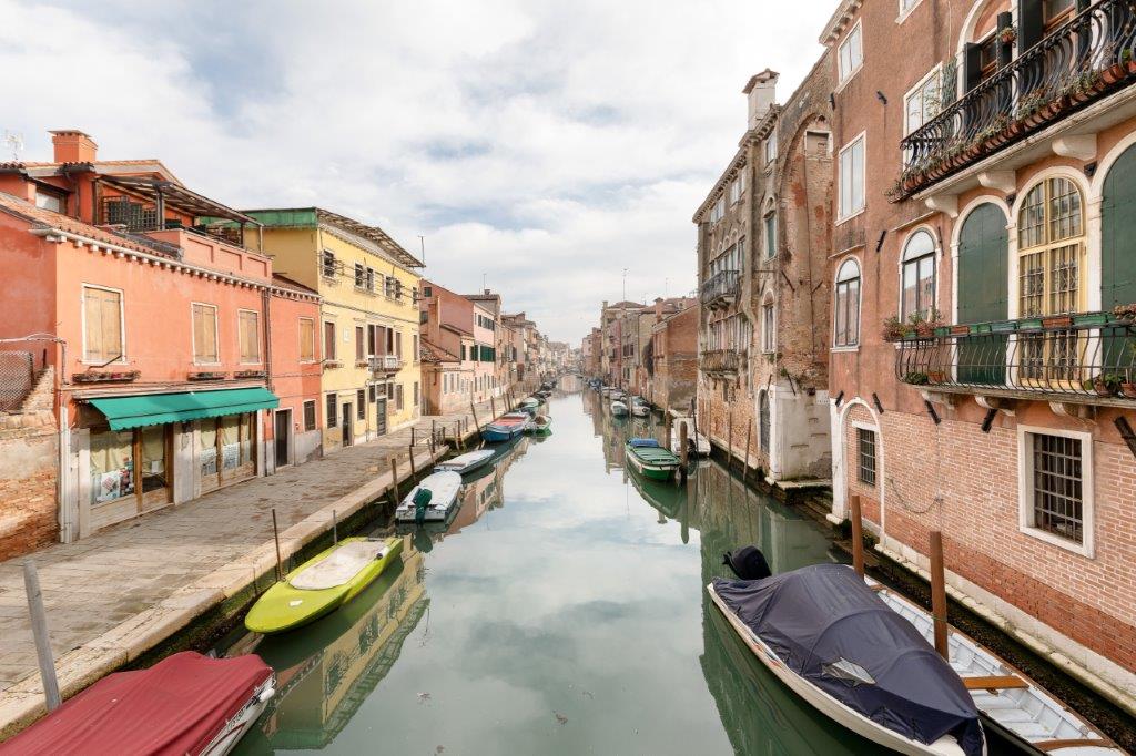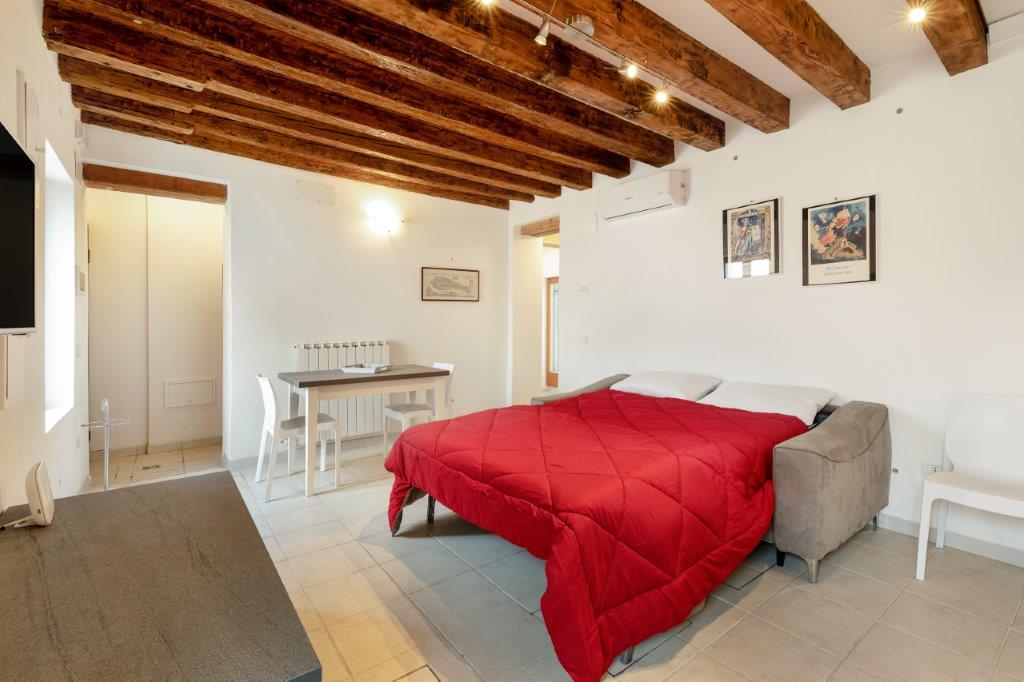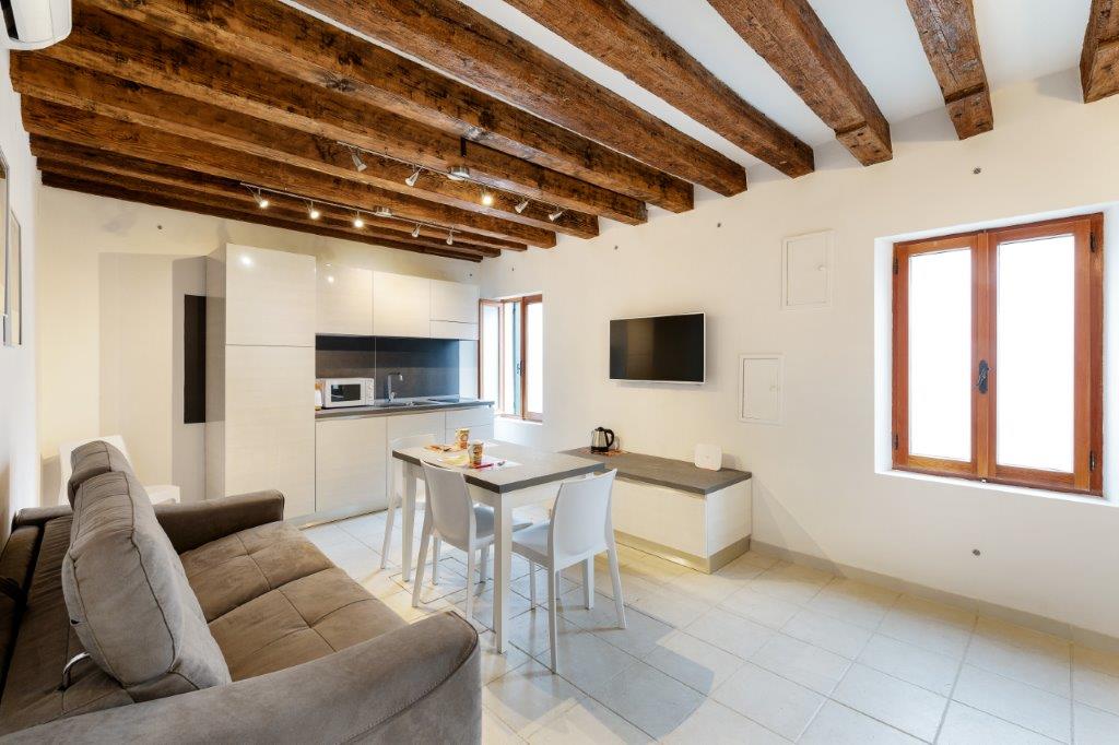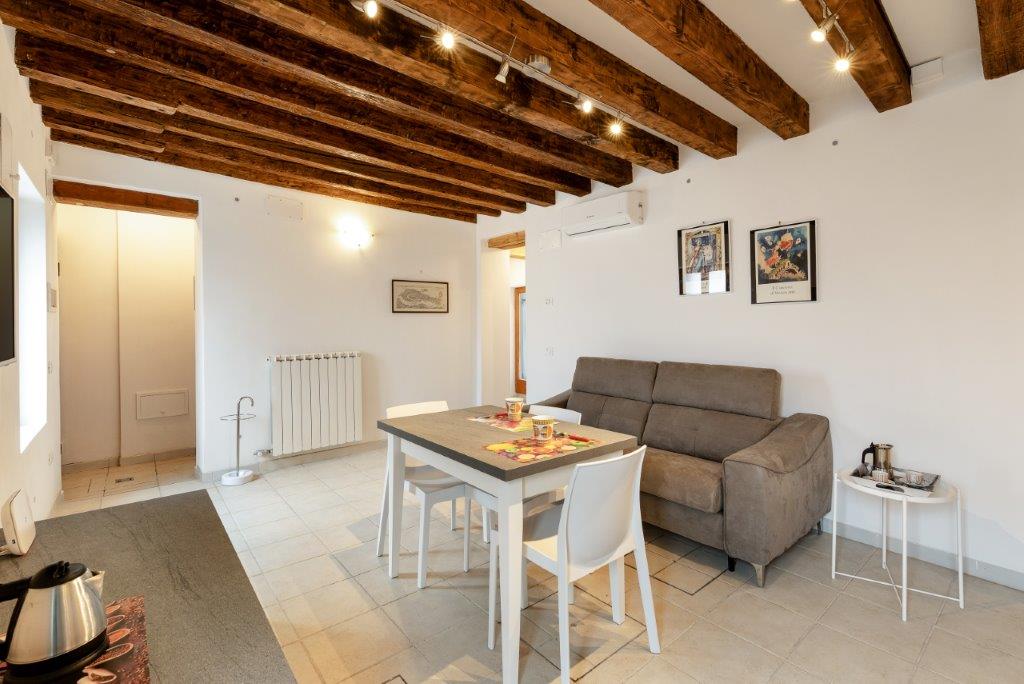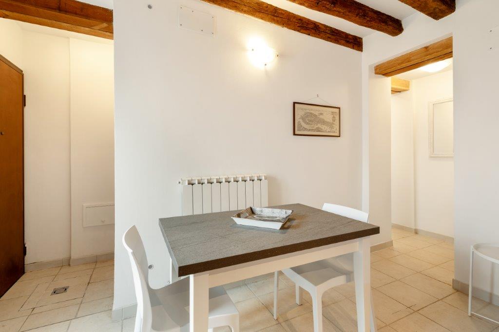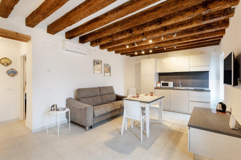 This ground floor 1 bedroom apartment in a historic Venetian building is located in a quiet and characteristic residential neighborhood, just a few steps from vaporetto transport, bars, shops and well-known restaurants. The apartment features garden access, air conditioning, an equipped kitchenette with separate dining space, wardrobe, and comfortably accommodates up to 4 guests at a time. TV, unlimited wifi, and utilities are also included.