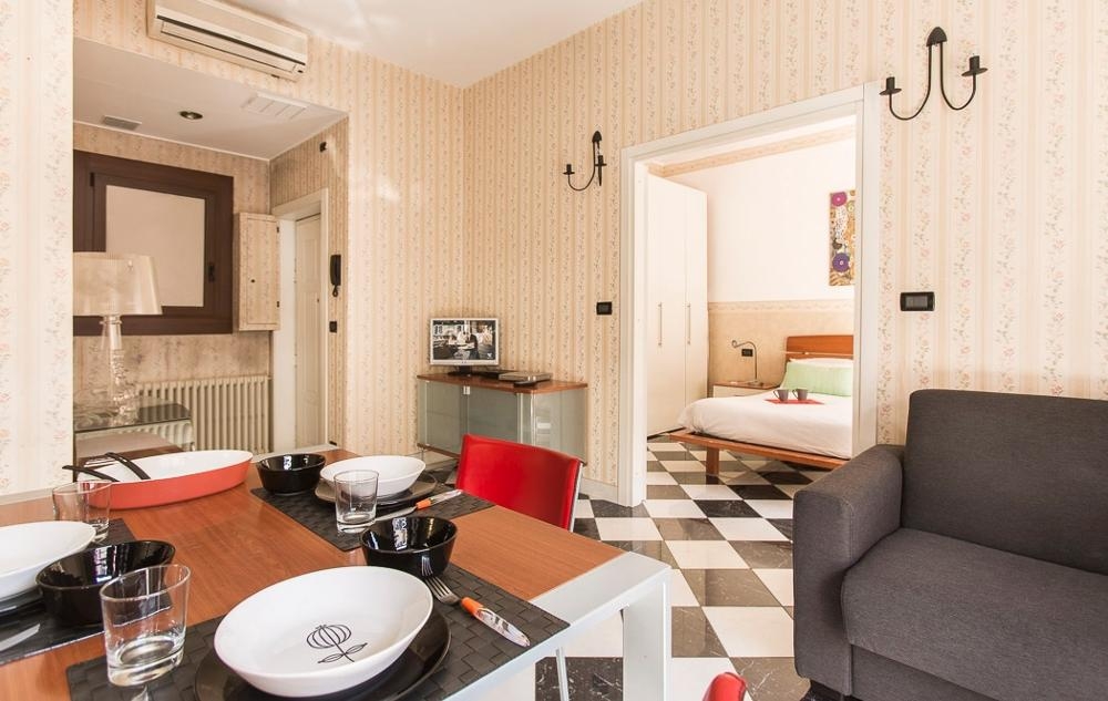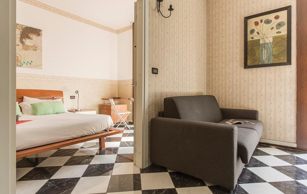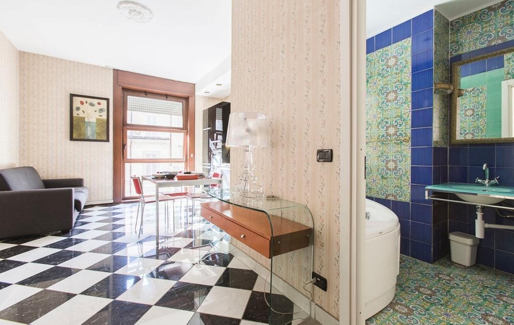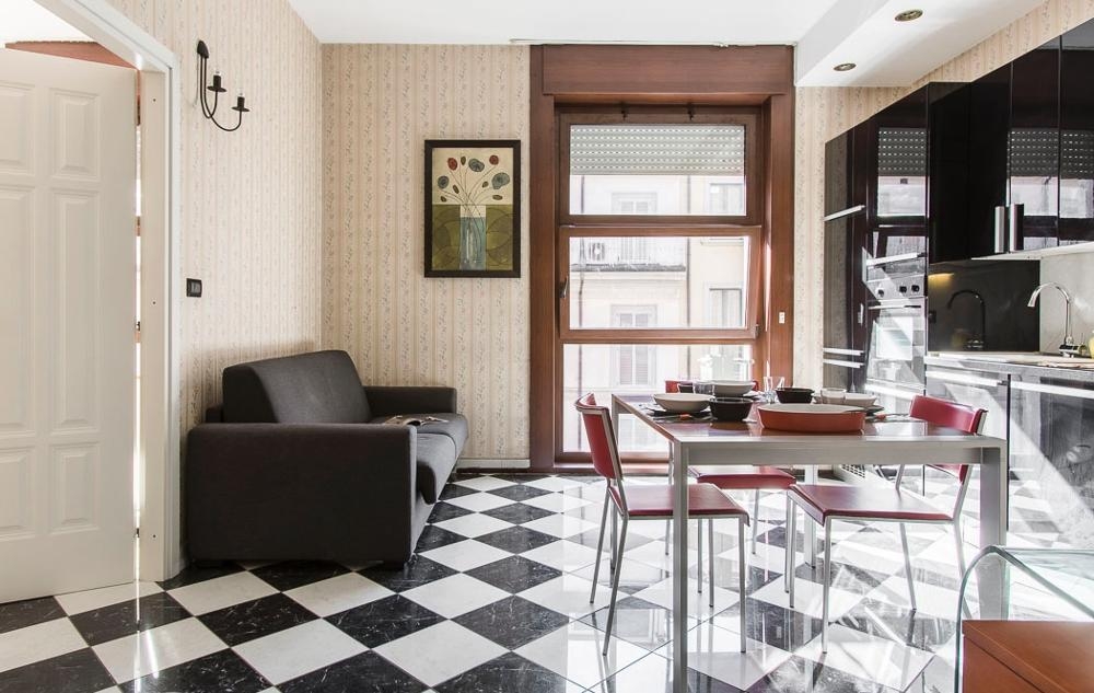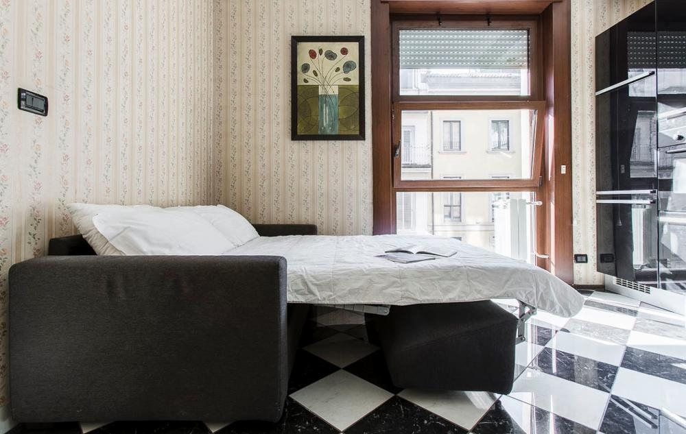 Comfortable one bedroom apartment with all modern amenities located on the fourth floor of a stately building with elevator nestled in the very heart of Milan city centre at just 100 metres from the Duomo